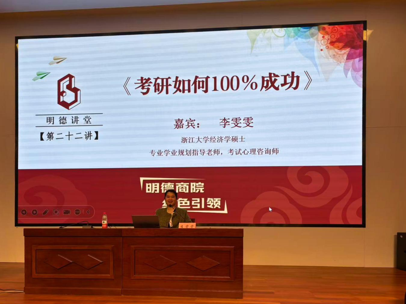 12月18日下午,商学院在人文5111智能报告厅举行考研动员大会暨第二十二期明德讲堂《考研如何100%成功》讲座。浙江大学经济学硕士、专业学业规划指导老师李雯雯受邀主讲,商学院院长何红光出席并作考研动员讲话。